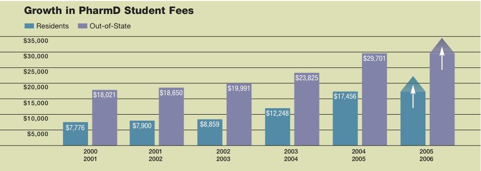 Growth in PharmD Student Fees: This chart depicts fees in 2000–2001 were $7,776 (residents) and $18,021 (out-of-state), and over the next four years they grew to $17,456 (residents) and $29,701 (out-of-state) in 2004–2005. Firm estimates for 2005–2006 fees were not yet available when this update was published in March 2005.