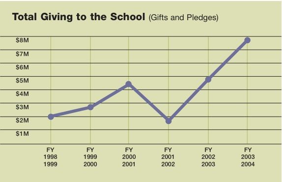Total Giving to the School (Gifts and Pledges): This chart depicts gifts and pledges in 1998–1999 at $2 million, and over the next five years they grew to nearly $8 million.