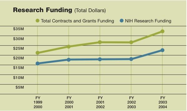 Since 2003, our research has continued to flourish. At the close of September 2004, our NIH funding had increased by 25% from the previous fiscal year, from $18,107,279 to $22,670,830. Grants from funding sources other than NIH totaled an additional $9,604,746 for the same time period, bringing the total contract and grant funding from all sources to $32 million. This is an impressive increase of 18% from the previous fiscal year.