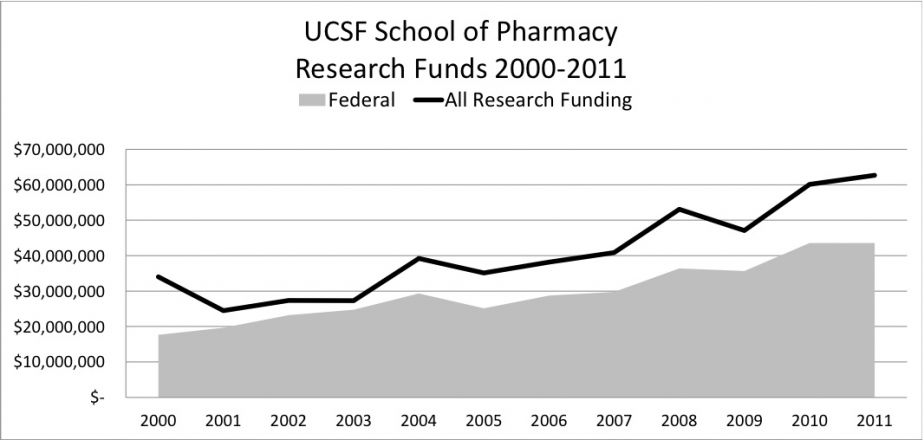 The total federal research grants received by the School faculty grew from $17.6 million in 2000 to $43.5 million in 2011; most of these funds were from the National Institutes of Health (NIH). In fact, the faculty continues to receive more research funding from the NIH than any other pharmacy school in the nation. When we tally research funds received from all sources in 2011—including other public, private, and not-for-profit sources—the figure jumps to approximately $62.6 million. Diversifying our sources of funds for research is increasingly important as the NIH budget flattens and competition for these funds becomes ever more challenging.