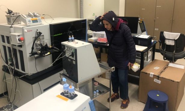 Jacqueline Fabius looks at mass spectrometer.