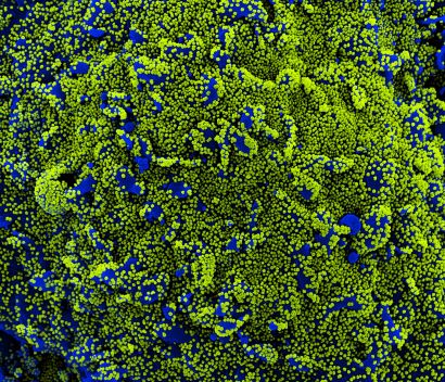 A cell (blue) heavily infected with SARS-CoV-2 virus particles (green), isolated from a patient sample.