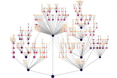 A birds-eye depiction of the findings from the Quantitative Biosciences Institute’s recent work on cancer. Each node represents a protein system and darker-colored nodes are more likely to be involved in cancer.